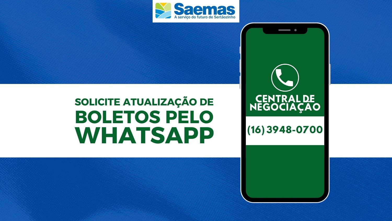 Os usuários do SAEMAS poderão atualizar os boletos através do WhatsApp, enviando uma mensagem para o número (16)3948-0700, ou através do link: https://wa.me/551639480700. A falta de atualização do cadastro pode comprometer a emissão e pagamento de faturas.